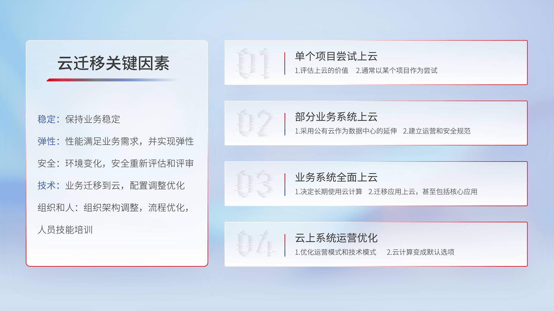 结合实际业务,,,从规划设计、、、、云平台选型、、、、云原生改造、、数据迁移、、集成交付,,,,迁移全过程为客户识别最佳上云路径,,,,做好风险识别管理,,,设计网络架构、、、、身份权限、、、安全审计合规、、、、操作审计、、、日志审计、、监控告警策略、、、、多站点容灾设计等,,对云上基础设施进行整体规划,,,提升IT治理水平,,以满足弹性、、、高可用、、、、高性能的需求。。。。
