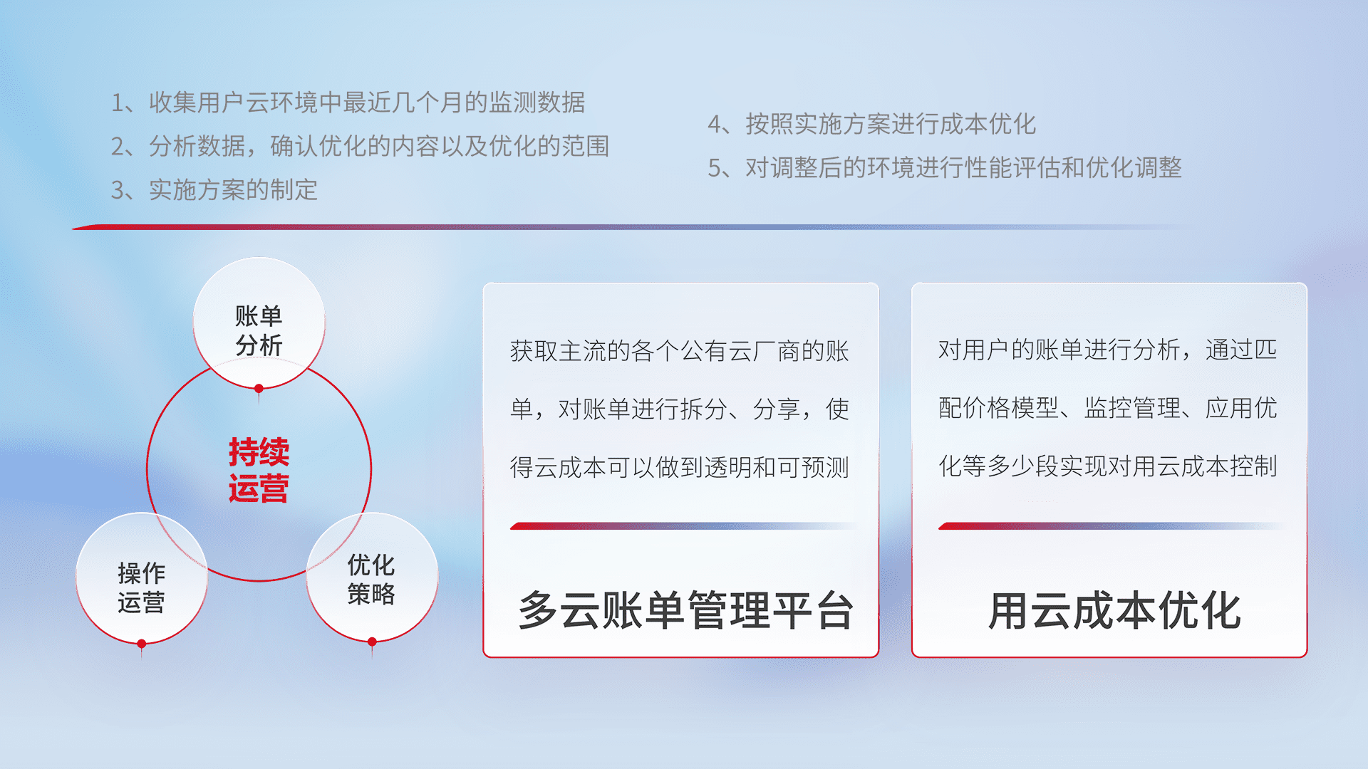 通过多云纳管,,以统一的资源数据模型把客户的云资源进行抽象和封装,,,进而实现对多云资源的统一操作,,保障云资源管理的可靠性、、稳定性与可用性。。。。量身定制化运维内容,,,,配置、、、、开发运维、、、、补丁管理、、、、备份、、、监控、、、认证和访问管理、、、、审计和日常巡检等,,,保障在用云过程中的可靠度,,稳定度以及高可用率。。。